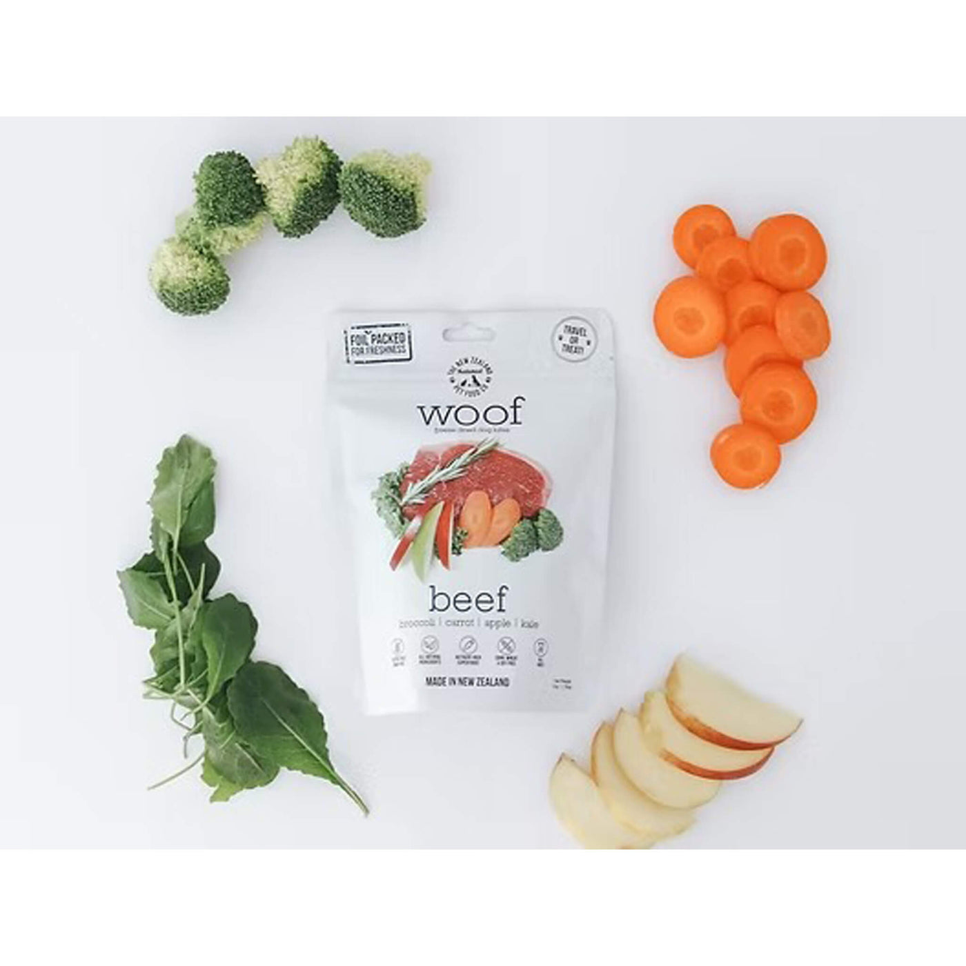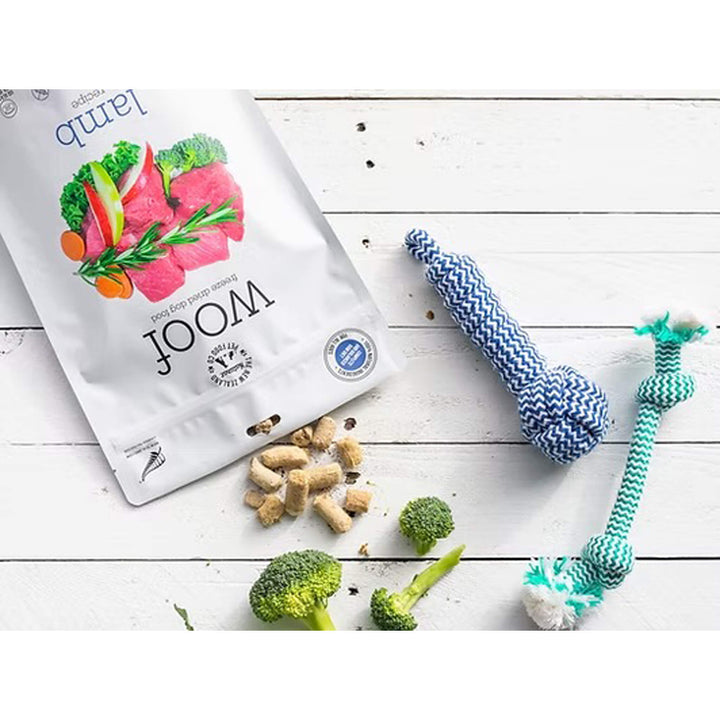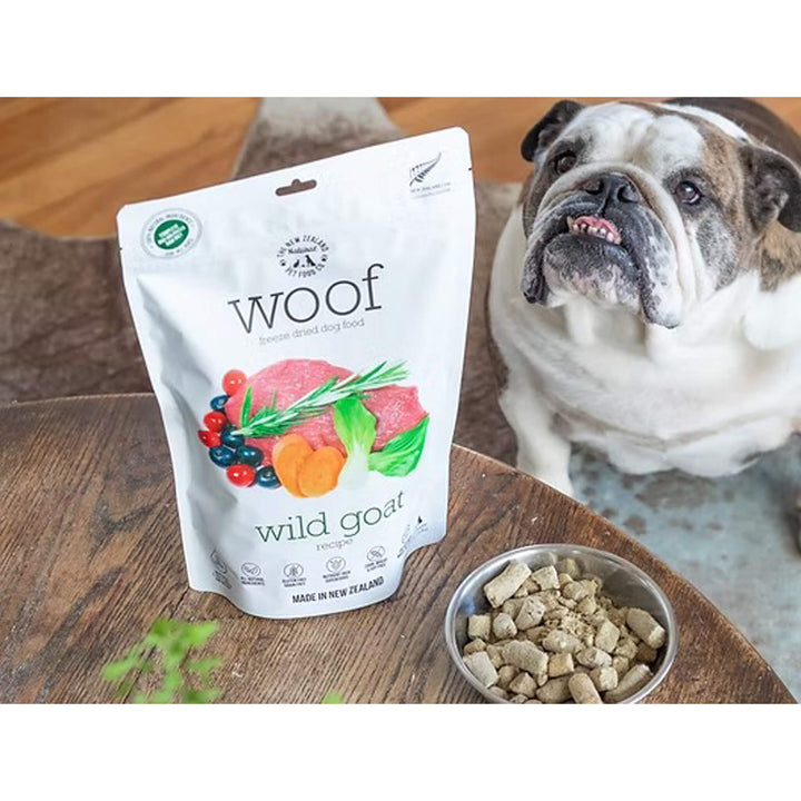 Serve WOOF Freeze Dried Dog Food as a complete freeze-dried meal for dogs whose diets are centered on quality meat ingredients and thoughtful sourcing.