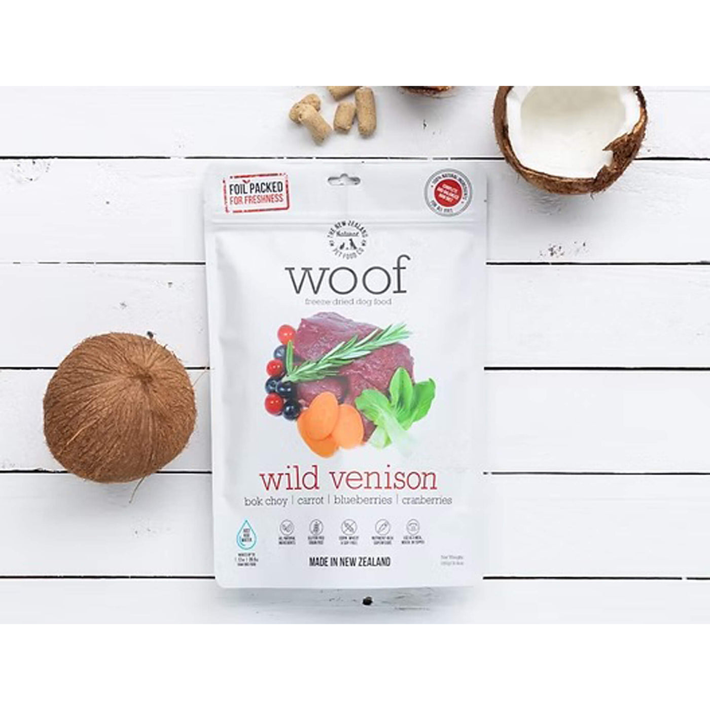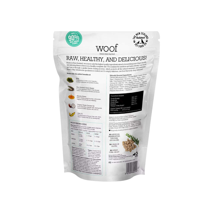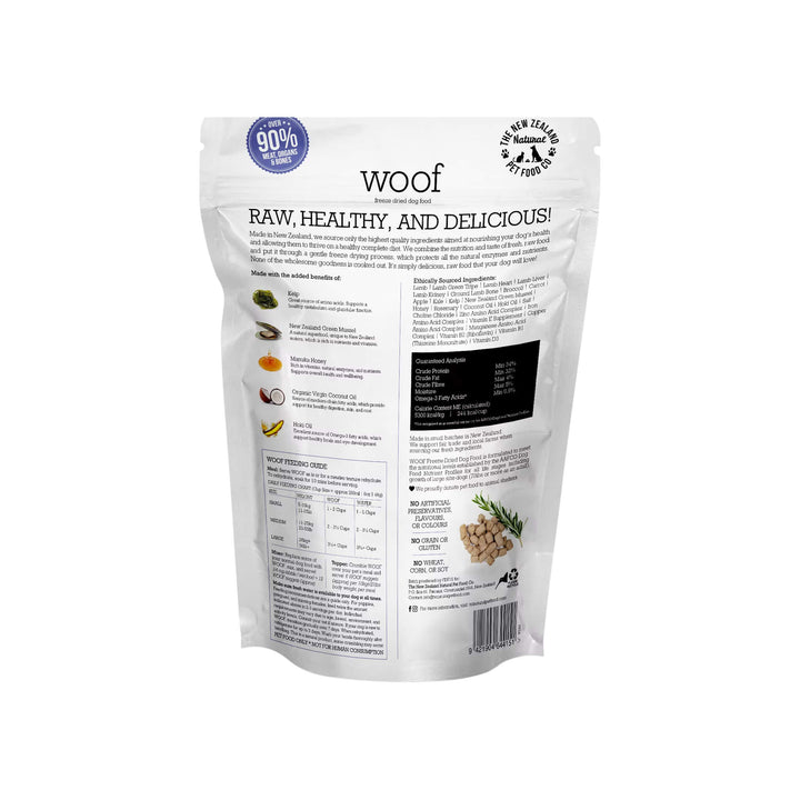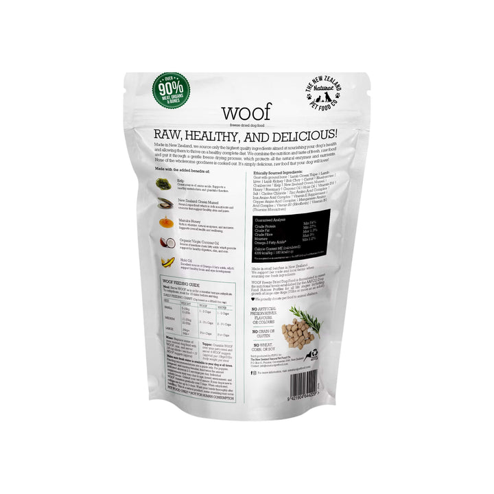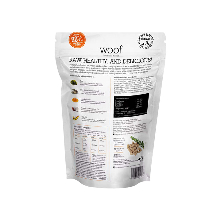 Sourced and produced in New Zealand, WOOF Freeze Dried Dog Food reflects a commitment to responsible sourcing and ingredient integrity. This high protein freeze dried raw dog food concentrates nutrients through minimal processing, preserving the natural character and flavor of its ingredients.