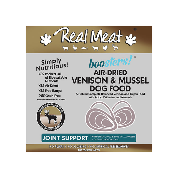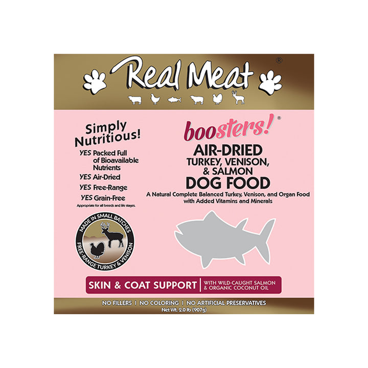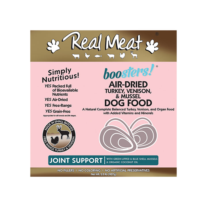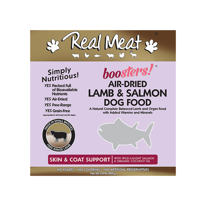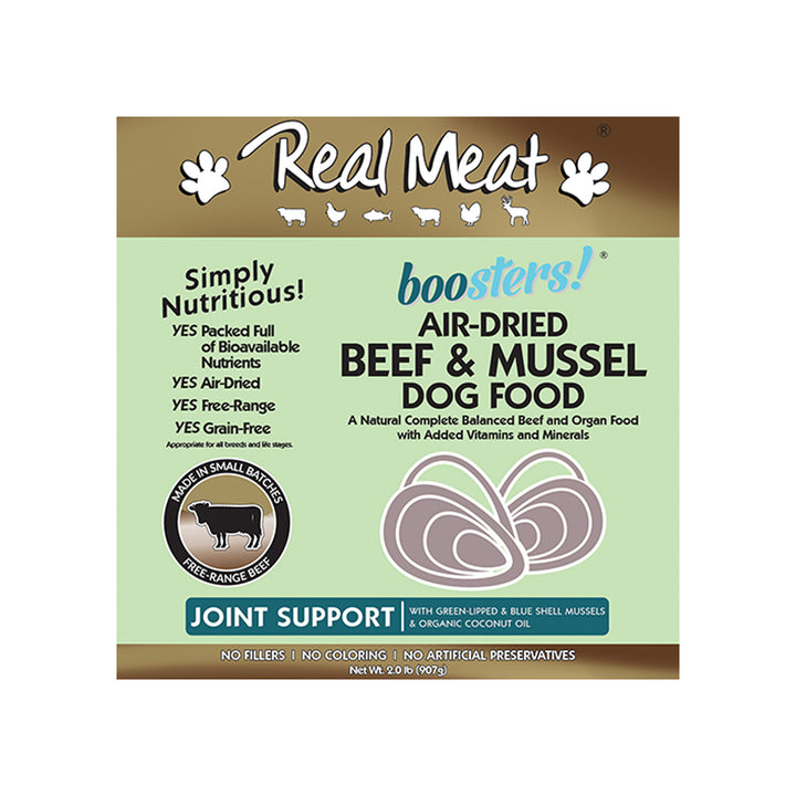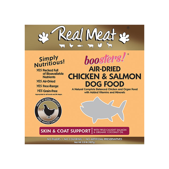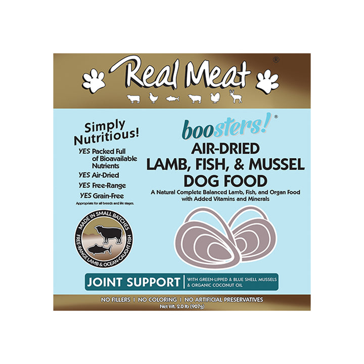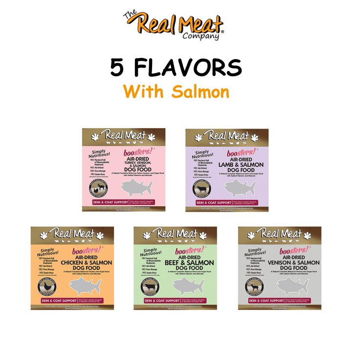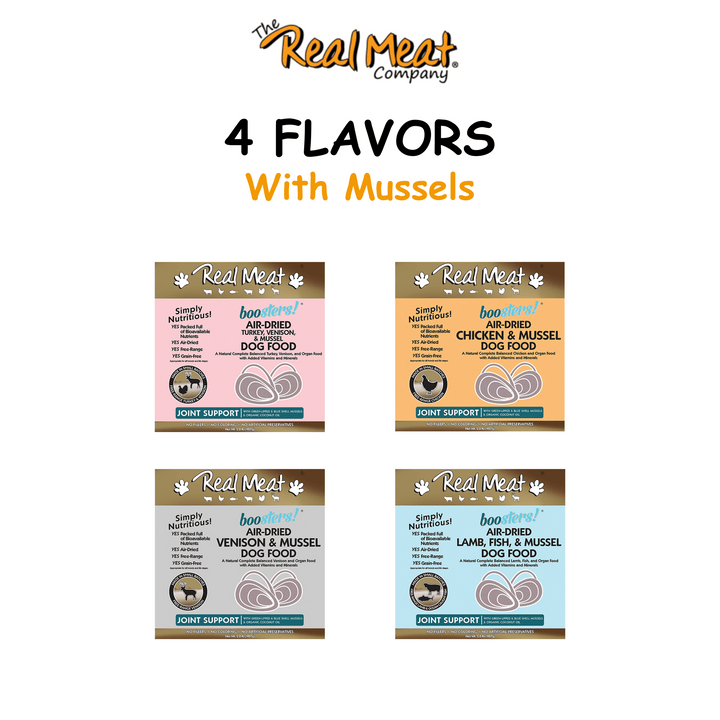 The Real Meat Company Boosters Air-Dried Dog Food is a culinary delight for your canine companion. This premium dog food combines the best of land and sea with two delicious recipes: one featuring with wild-caught Alaskan salmon and salmon oil, and the other with green and blue mussels.