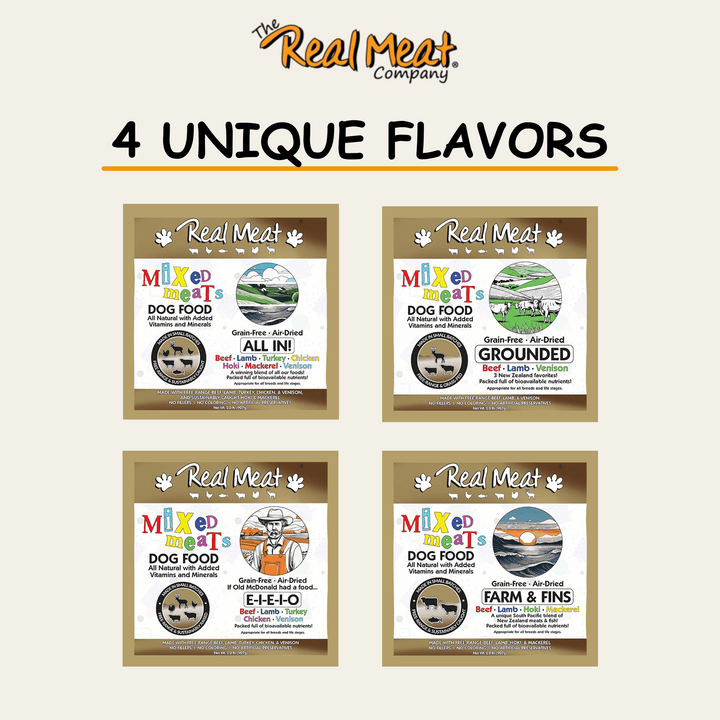 The Real Meat Company Mixed Meats Air Dried Dog Food is a culinary celebration of the finest meats nature has to offer. This all-encompassing blend features a variety of high-quality, air-dried proteins, ensuring your dog receives a rich and diverse source of nutrients. Choose from four unique blends, each crafted to cater to your dog's instinctual love for meat and provide essential nutrition for a healthy life.