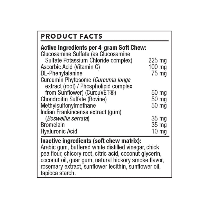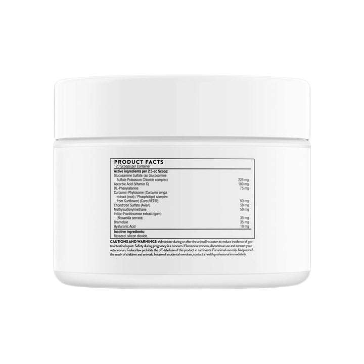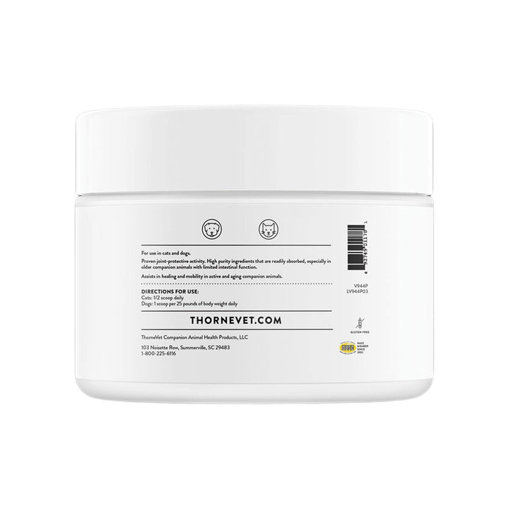 ThorneVet Joint Support Formula Dog & Cat Supplement supports healthy joint function by combining the proven joint supportive activity of glucosamine sulfate with specific nutrients and botanicals to help maintain the animal's normal inflammatory response. The top quality ingredients in this formula provide a broad spectrum of activity.