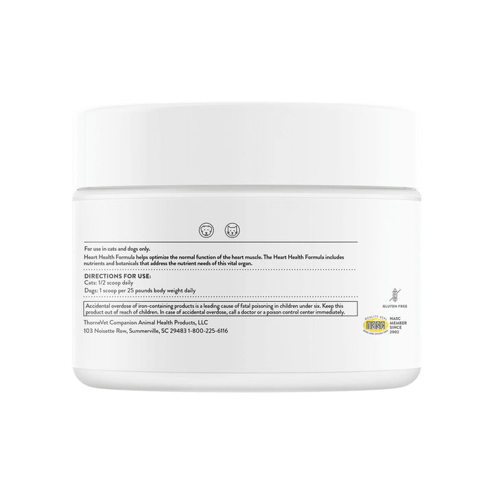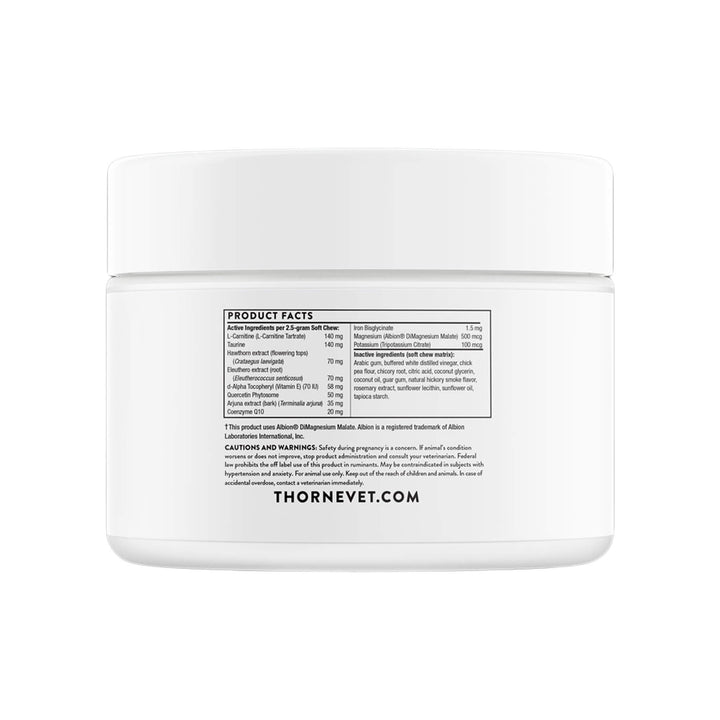 ThorneVet Heart Health Formula Dog & Cat Supplement combines the antioxidant and cardio-protective qualities of CoQ10 with other cardio-protective nutrients and botanicals. Research on CoQ10 in animals demonstrates it promotes the heart's oxygen utilization and helps maintain a healthy myocardium.