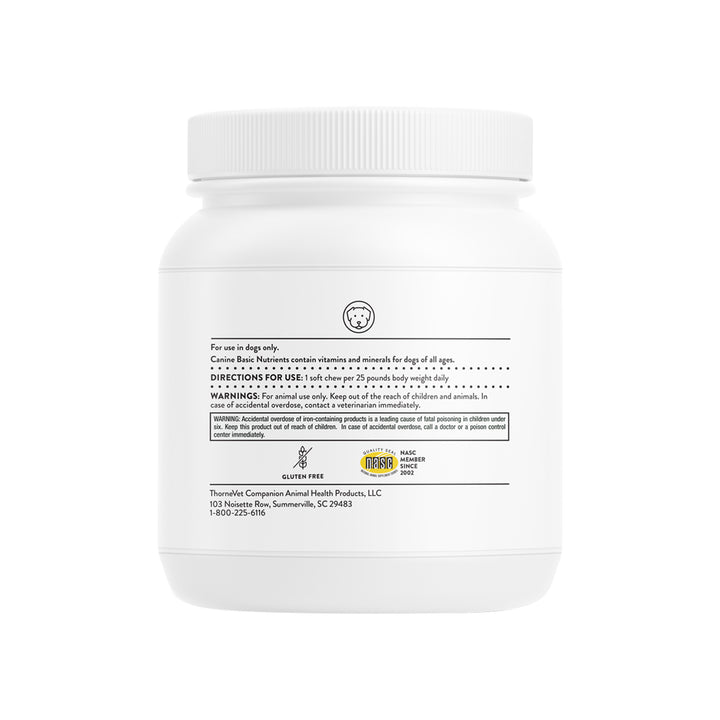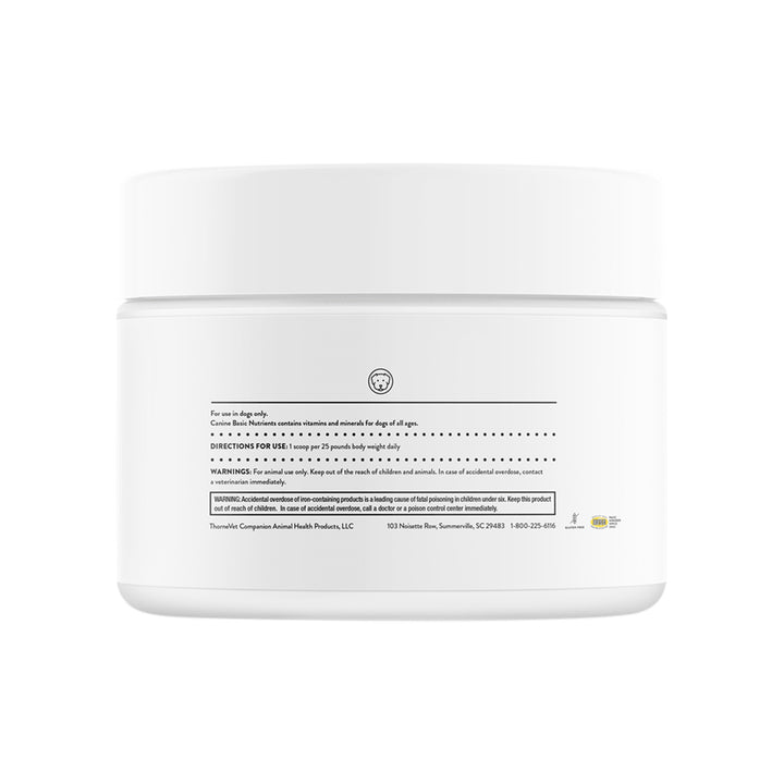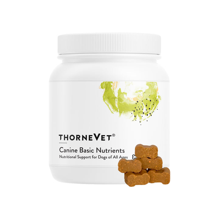 ThorneVet Canine Basics Nutrients Dog Supplement is a premium dietary formula crafted to address the challenges posed by modern processed dog food and environmental pollutants. This supplement aims to bridge the nutritional gaps in a dog's diet, ensuring they receive essential vitamins and minerals crucial for their overall health and vitality. Whether in the early stages of development or in their golden years, this supplement is intended for use across all phases of a dog's life. By incorporating a diverse range of nutrients, including calcium, magnesium, potassium, zinc, copper, and iron in highly absorbable forms, as well as active forms of vitamins B2, B6, B12, and folate, it provides comprehensive support for canine well-being.