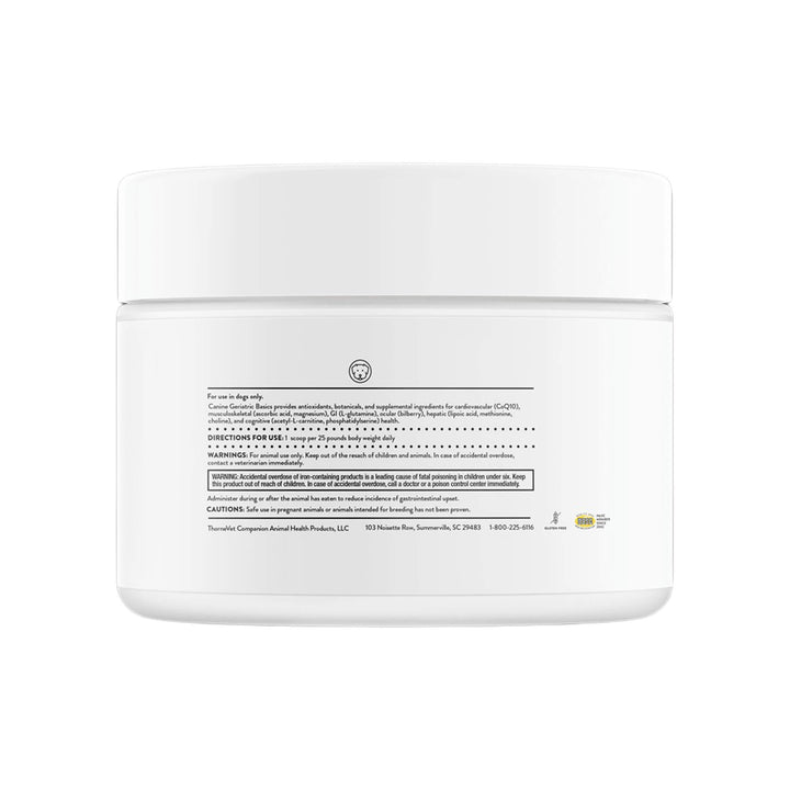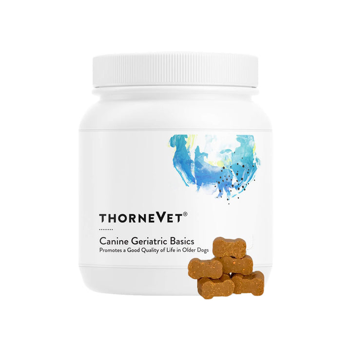 ThorneVet Canine Geriatric Basics Dog Supplement As dogs age, their nutritional needs evolve, requiring specialized support to maintain optimal health and vitality. ThorneVET's Canine Geriatric Basics is meticulously formulated to address the unique requirements of aging dogs, fortified with essential nutrients to support overall well-being. This advanced formula is enriched with amino acids, flavonoids, CoQ10, and potent antioxidants, meticulously chosen to combat oxidative stress and slow down the aging process in canine bodies.