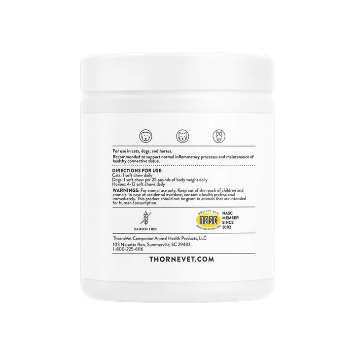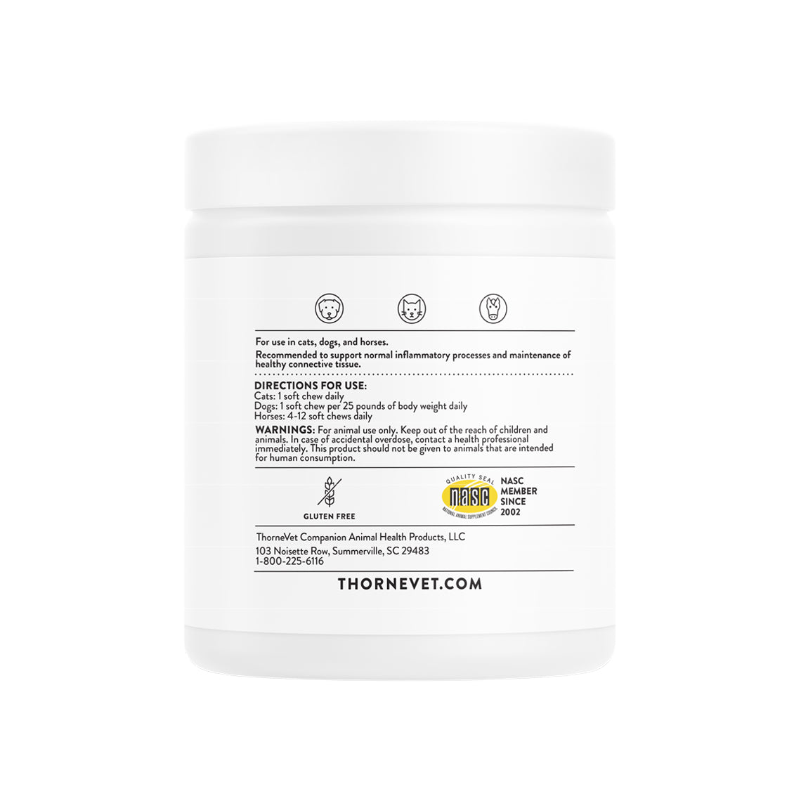 ThorneVet PhytoprofenVET Dog & Cat Supplement is a carefully formulated blend of botanical extracts designed to support the body's natural response to inflammation and promote musculoskeletal health in dogs and cats. This exclusive formula combines synergistic herbs like ginger, Boswellia, and curcumin (CurcuVET®), which are known for their anti-inflammatory and pain-relieving properties. By targeting cytokines, cell-signaling molecules involved in immune responses, PhytoprofenVET helps minimize swelling, tenderness, and discomfort following injury or surgery, thereby supporting the body's recovery process.
