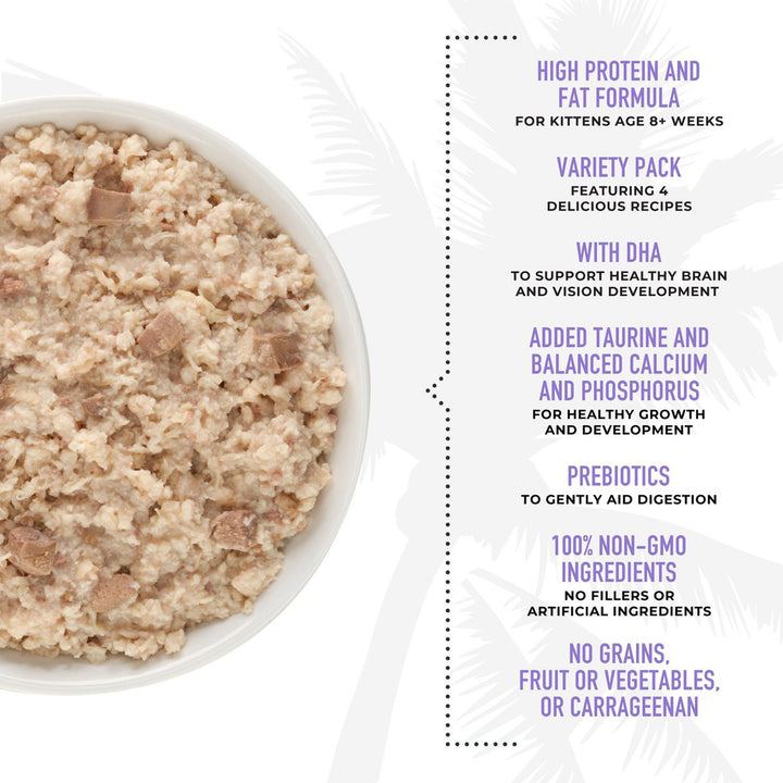 This variety pack features flavors such as Chicken & Salmon, Chicken, Tuna & Chicken Liver, Chicken, Duck & Duck Liver, and Chicken & Egg, providing a mix of delicious and nutrient-dense meals. Designed to give your kitten the best start in life, this grain-free wet food delivers flavor and nutrition in every bite.