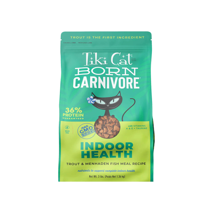 Indoor cats have unique dietary needs, from lower calorie requirements to support for digestion and hairball control. Tiki Cat Born Carnivore Indoor Health delivers high-protein nutrition in a grain-free formula tailored to the indoor lifestyle. This dry food for indoor cats is made with real meat as the first ingredient, offering your cat the flavor they crave with the nutrients they need to thrive.