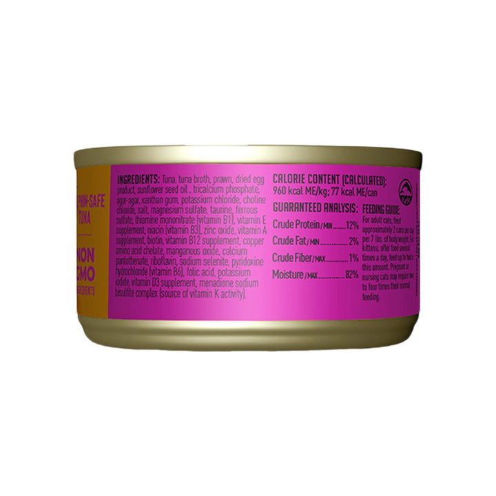 INGREDIENTS: Tuna, tuna broth, prawn, dried egg product, sunflower seed oil, tricalcium phosphate, agar-agar, xanthan gum, potassium chloride, choline chloride, salt, magnesium sulfate, taurine, ferrous sulfate, thiamine mononitrate (vitamin B1), vitamin E supplement, niacin (vitamin B3), zinc oxide, vitamin A supplement, biotin, vitamin B12 supplement, copper amino acid chelate, manganous oxide, calcium pantothenate, riboflavin, menadione sodium bisulfite complex (source of vitamin K activity), pyridoxine hydrochloride (vitamin B6), folic acid, potassium iodide, vitamin D3 supplement.