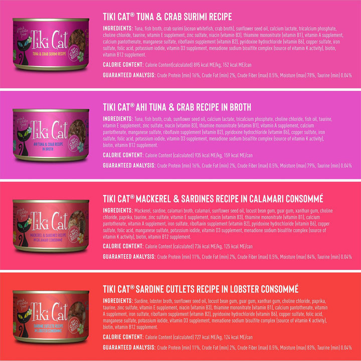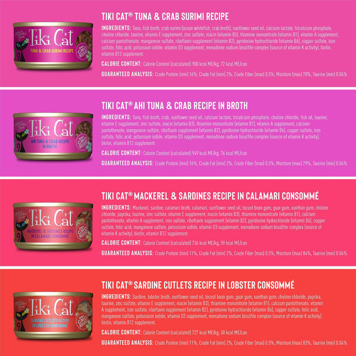INGREDIENTS: Tuna, fish broth, crab, sunflower seed oil, calcium lactate, tricalcium phosphate, choline chloride, fish oil, taurine, vitamin E supplement, zinc sulfate, niacin (vitamin B3), thiamine mononitrate (vitamin B1), vitamin A supplement, calcium pantothenate, manganese sulfate, riboflavin supplement (vitamin B2), pyridoxine hydrochloride (vitamin B6), copper sulfate, iron sulfate, folic acid, potassium iodide, vitamin D3 supplement, menadione sodium bisulfite complex (source of vitamin K activity), biotin, vitamin B12 supplement.