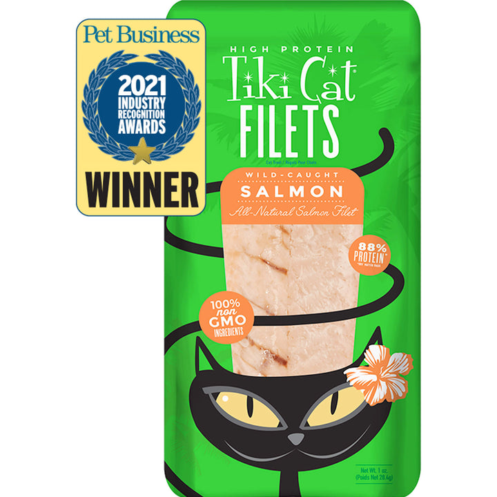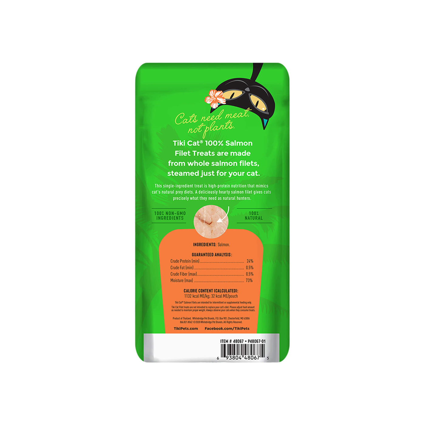 Tiki Cat Salmon Filet Cat Treats are made from 100% wild caught salmon treats for cats that deliver pure, natural flavor in every bite. These gently hand-cut fillets provide a high-protein, low-ingredient treat option that satisfies even the pickiest feline palates.