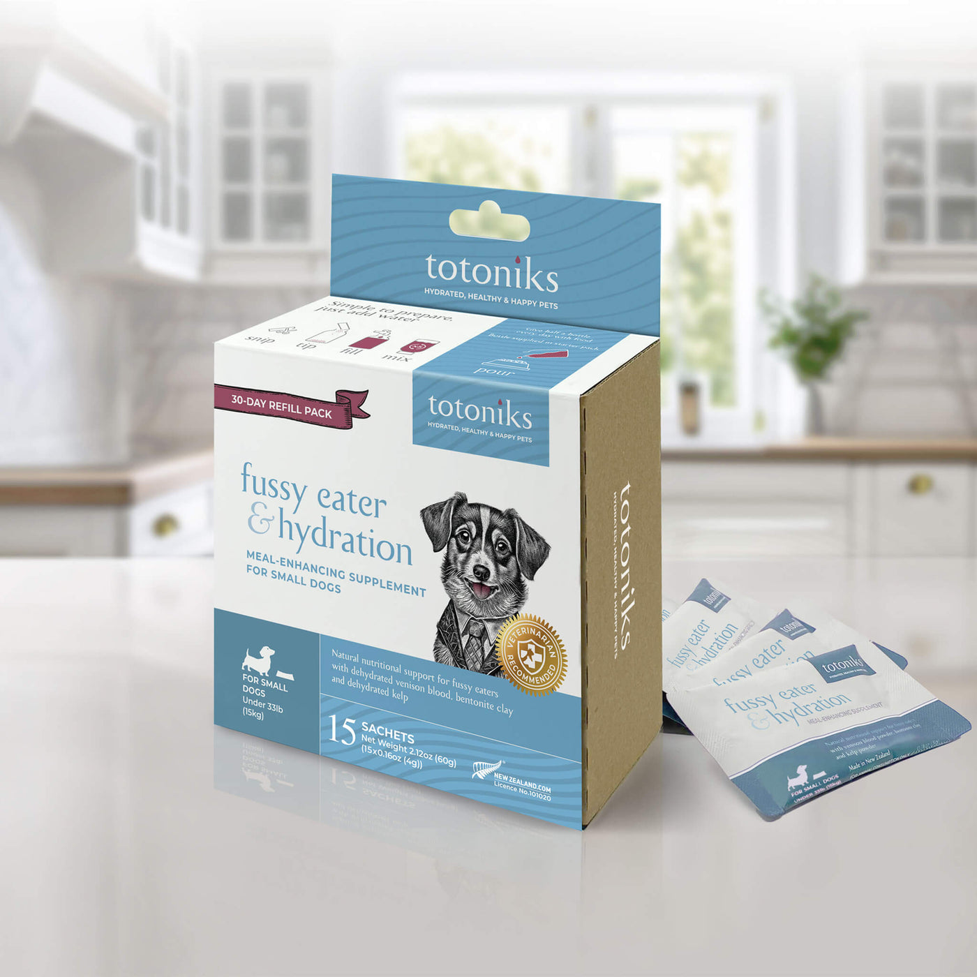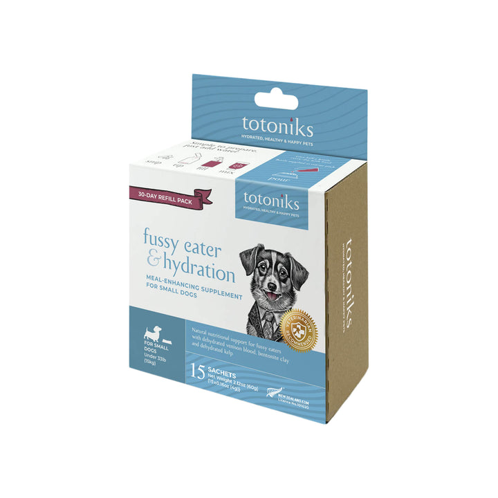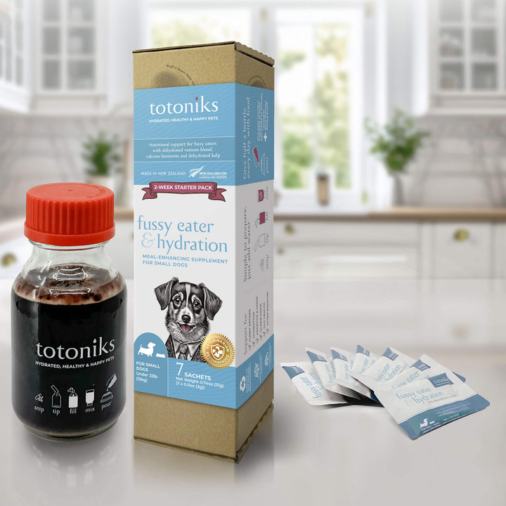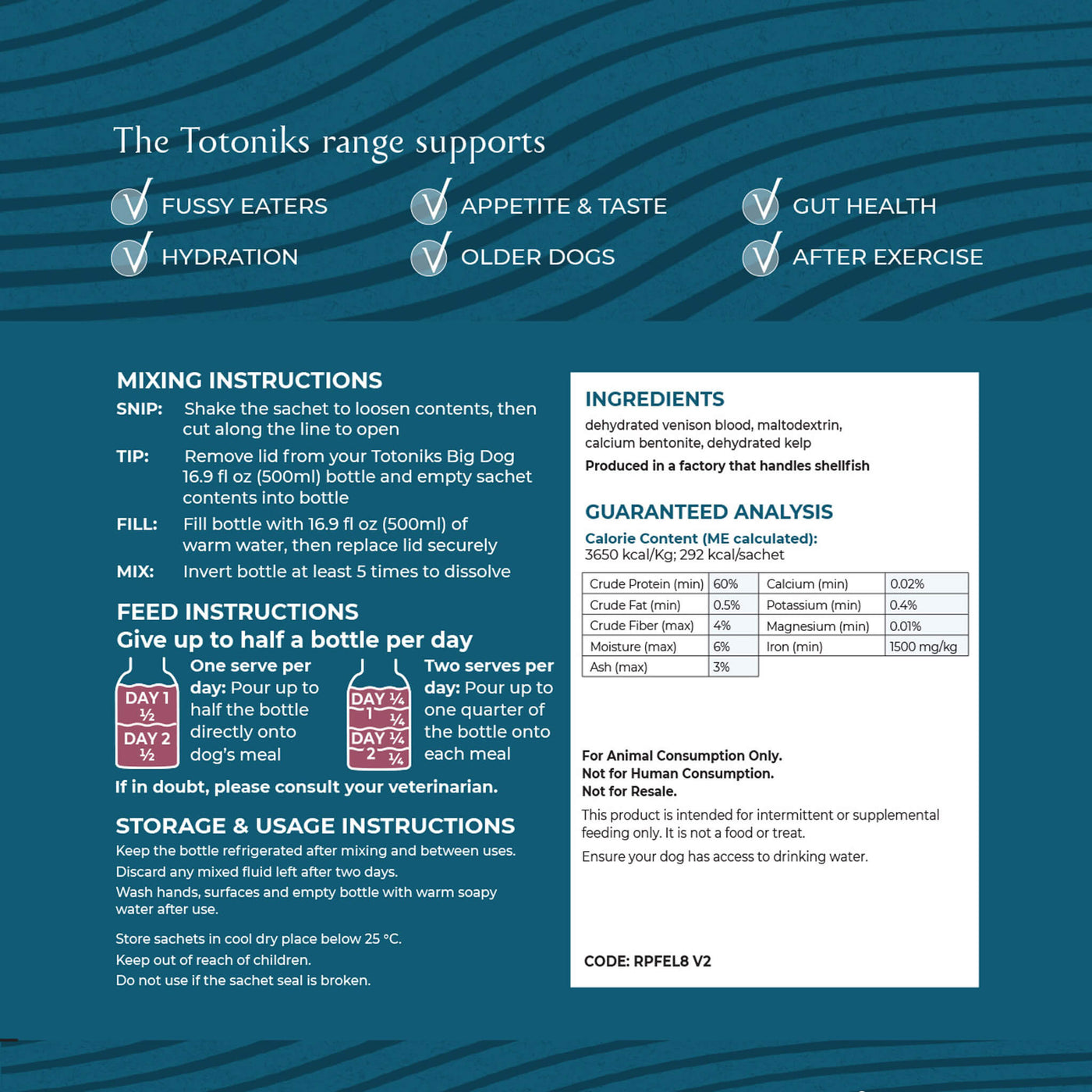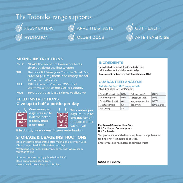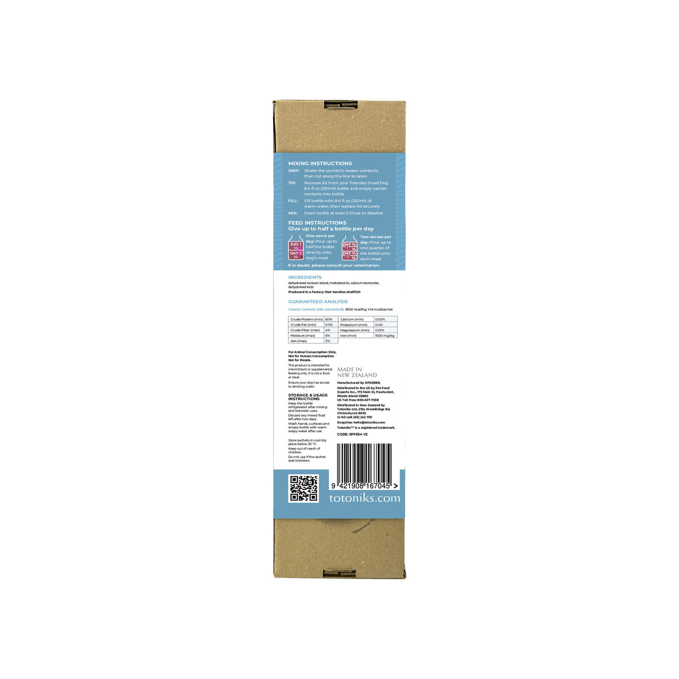 This kit includes a reusable glass bottle and 7 sachets of dehydrated venison blood mix—perfect for picky small dogs needing extra flavor and hydration support.Country of origin: New ZealandManufacturer: Totoniks - Ingredients