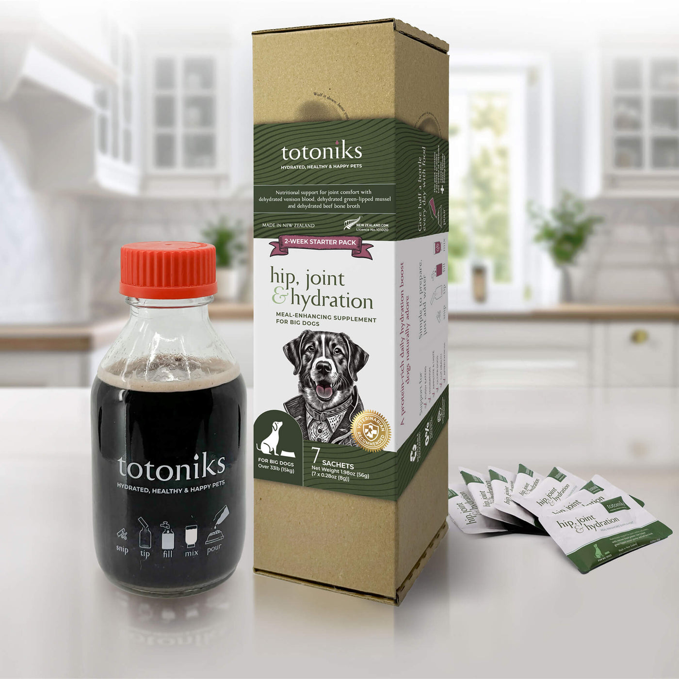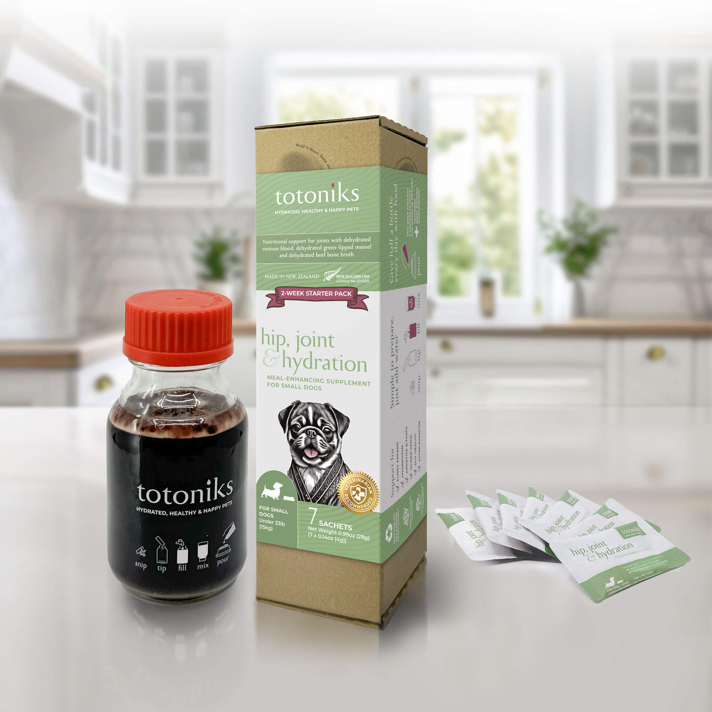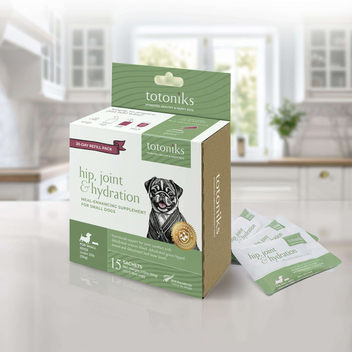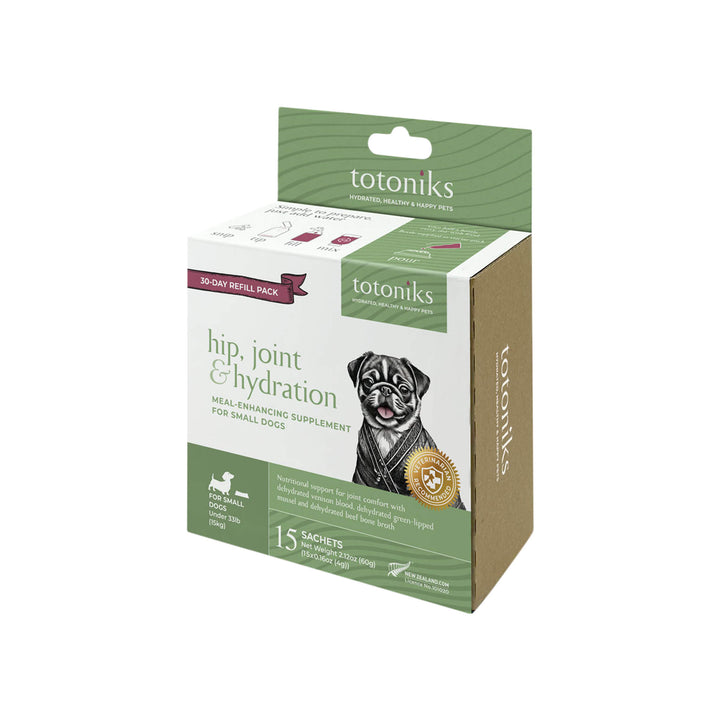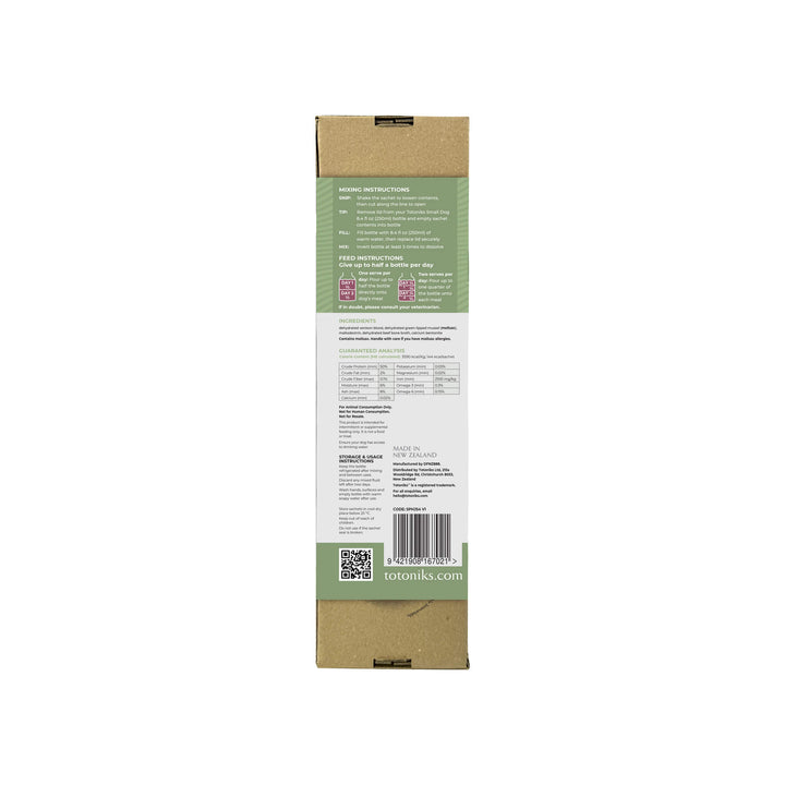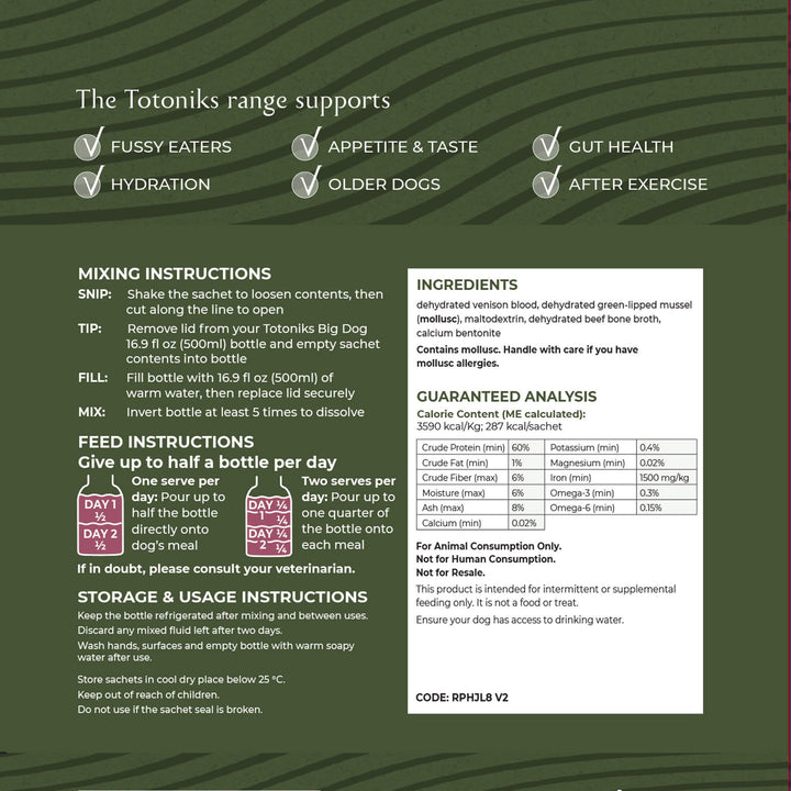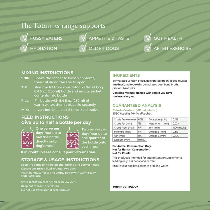 This kit includes a reusable glass bottle and 7 sachets of venison blood mix enriched with glucosamine and chondroitin—perfect for small dogs needing flavor, hydration, and joint support.Country of origin: New ZealandManufacturer: Totoniks - Ingredients