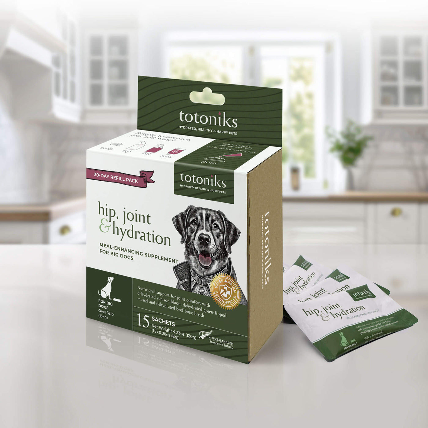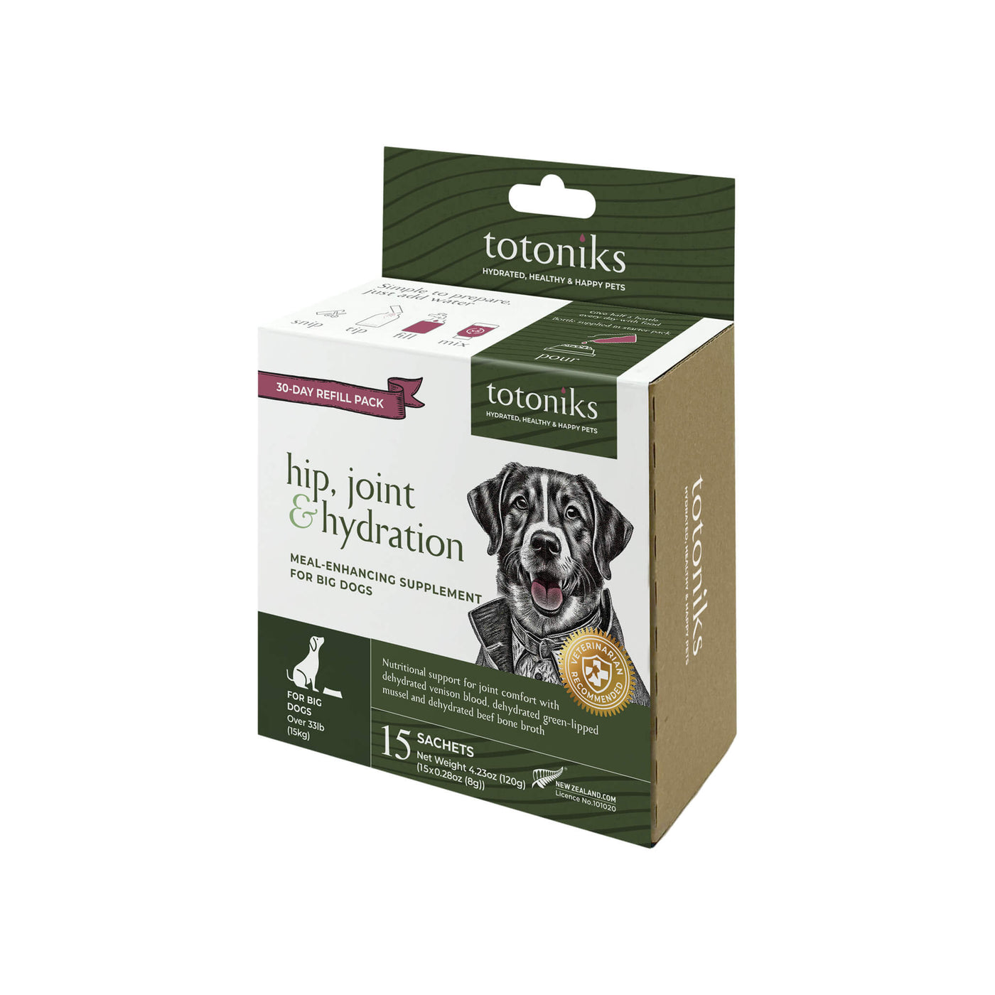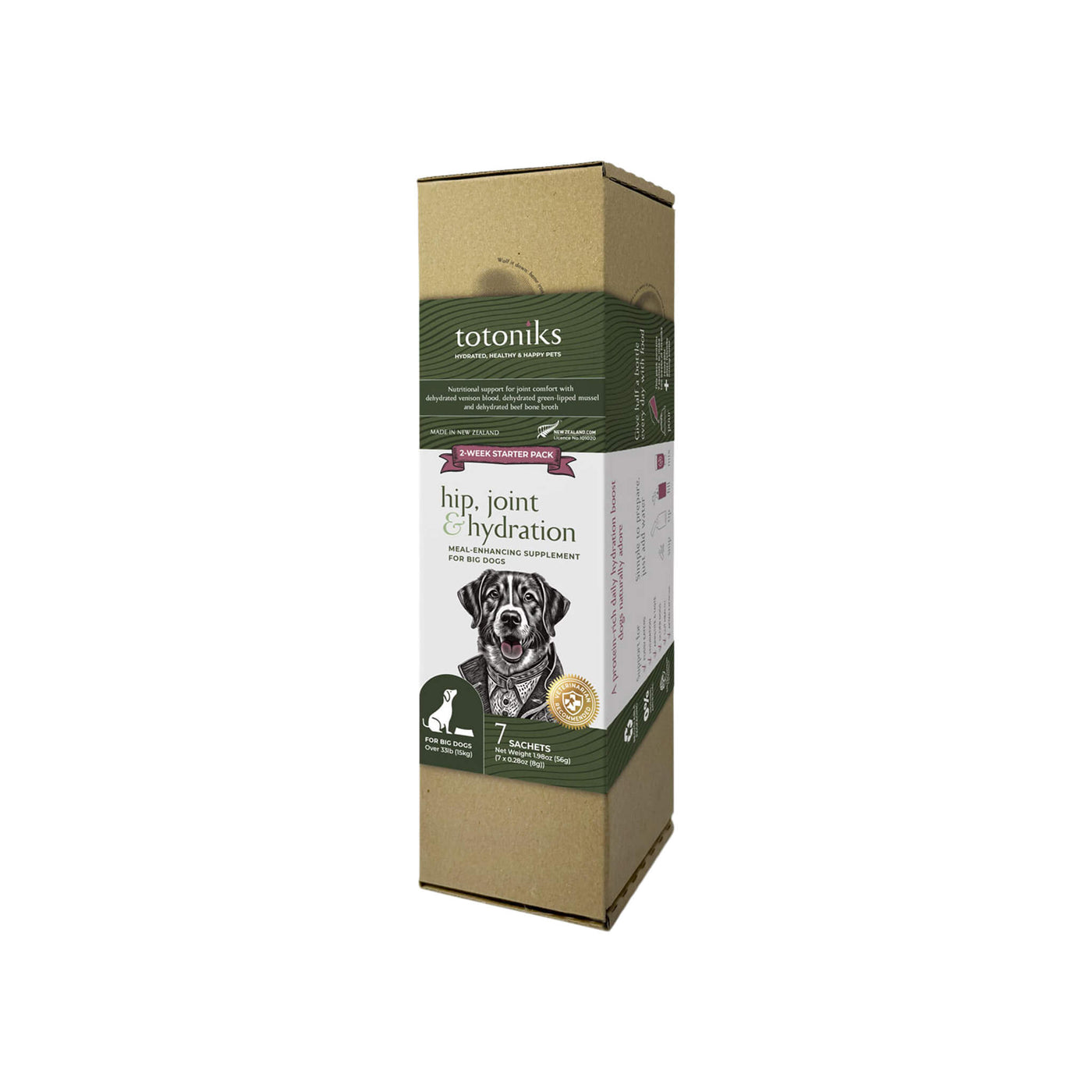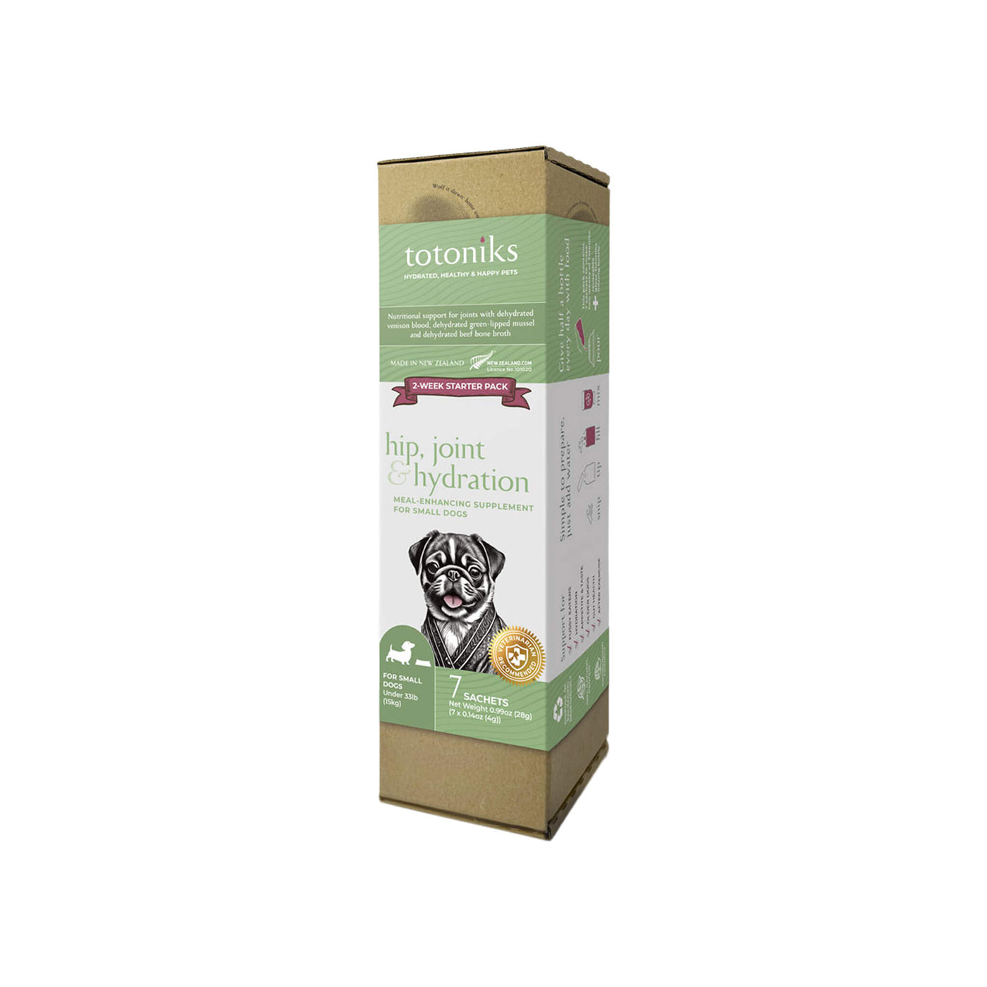 This kit includes a reusable glass bottle and 7 sachets of venison blood mix enriched with glucosamine and chondroitin—perfect for small dogs needing flavor, hydration, and joint support.Country of origin: New ZealandManufacturer: Totoniks - Ingredients