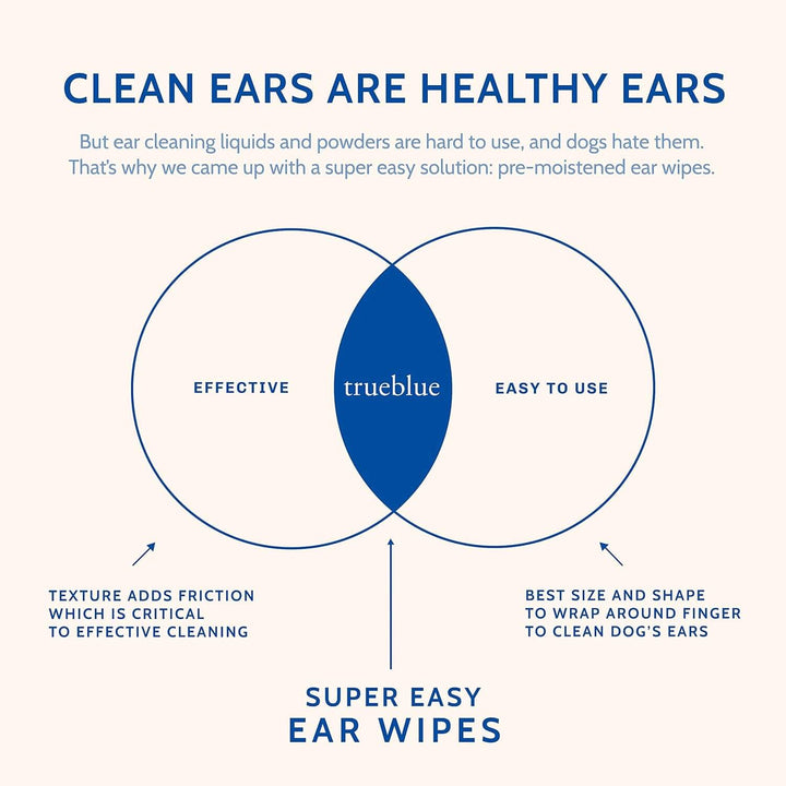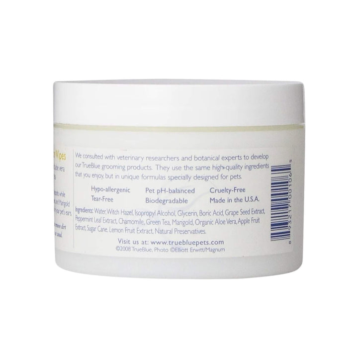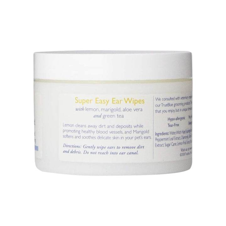 TrueBlue Super Easy Ear Wipes with Lemon, Marigold, Aloe Vera, & Green Tea are pre-moistened with an all-natural botanical blend for safe, yet effective cleaning. Lemon cleans away dirt and deposits while promoting healthy blood vessels, and marigold softens & soothes the delicate skin in your dog’s ears.