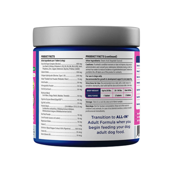 Made with a nutrient-rich organ meat complex and patented digestive enzymes, Vetericyn ALL-IN Puppy Supplement ensures optimal absorption of vitamins, minerals, and amino acids. This vitamin supplement for puppies also includes antioxidants and a mushroom blend to support neurological health and reduce stress—making it ideal for daily wellness and long-term vitality.