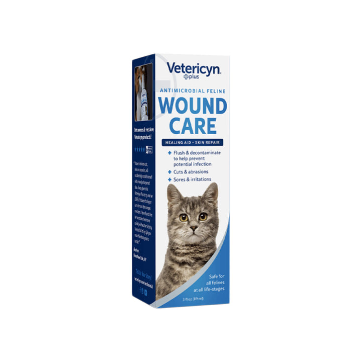 Vetericyn Plus Feline Wound & Skin Care for Cats is an antimicrobial cat wound treatment designed to clean, flush, and soothe minor cuts, abrasions, and irritations. This non-toxic liquid formula helps prevent infection and supports healing without stinging or burning—making it ideal for sensitive areas like the face, ears, and paws.