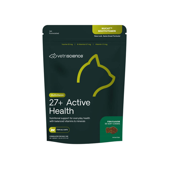 Support whole-body wellness with VetriScience 27+ Active Health for Cats. This daily formula features over 25 essential vitamins, minerals, and nutrients to promote immune function, energy production, and healthy skin and coat. It’s an ideal daily multivitamin for cats of all ages, especially those needing a nutritional boost.
