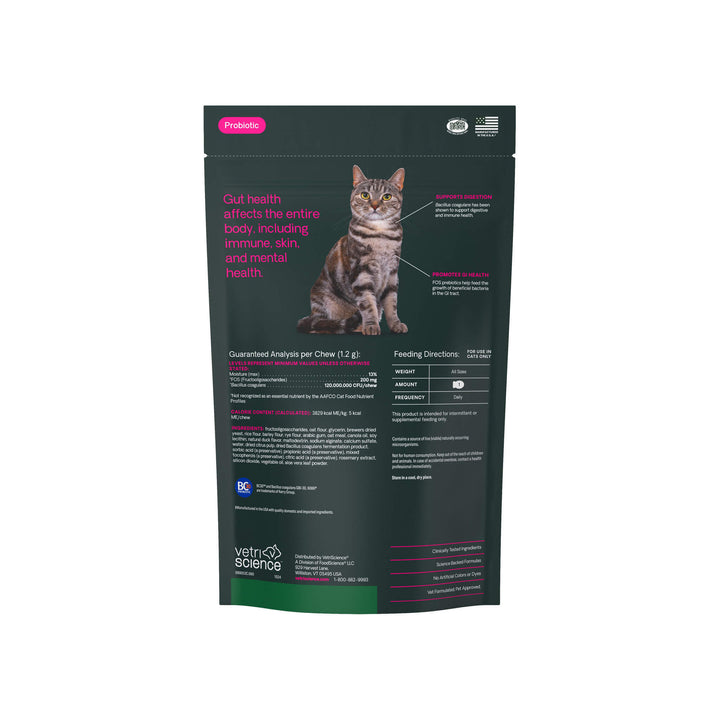 Support digestive wellness with VetriScience Probiotic Gut Health for Cats. Each soft chew delivers one billion CFUs of Bacillus coagulans along with prebiotic FOS to help maintain healthy digestion and gut flora. It’s a simple solution for cats experiencing occasional upset or needing daily microbiome support.