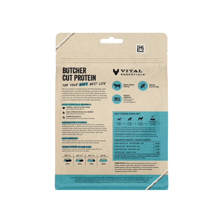 Vital Essentials Freeze-Dried Raw Protein Mix-In Ground Topper for Dogs provides the essential, natural nutrition necessary for your dog's peak performance. With whole meat, bones and organs, the premium ingredients help your dog maintain top body condition and build a foundation for a proactive health program. Your dog will thrive as the essential nutrients provide increased vitality and energy.