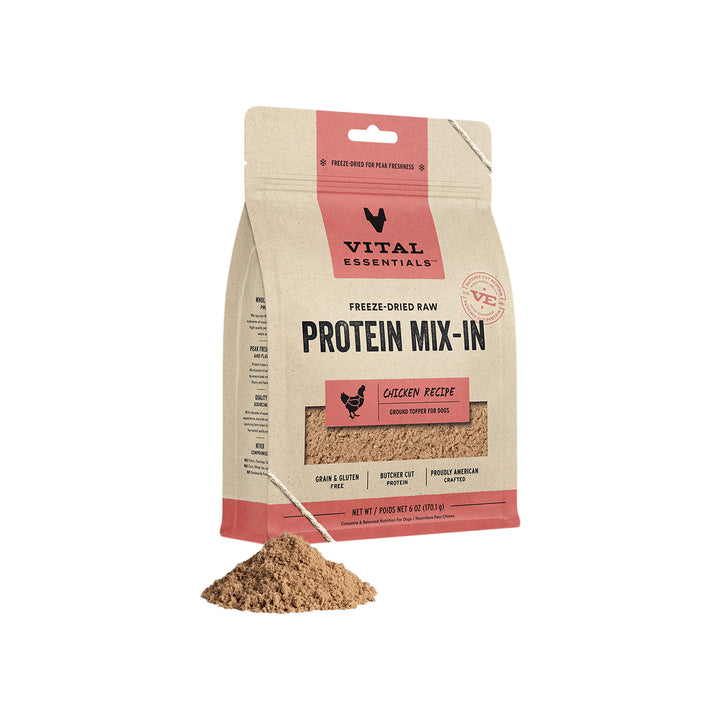 In addition to promoting your dog's overall health, Vital Essentials Protein Mix-In Ground Topper also supports and maintains a healthy digestive system, strong bones, a shiny coat, healthy skin, clean teeth and weight control. Best served as a topper or protein boost, perfect for picky eaters.