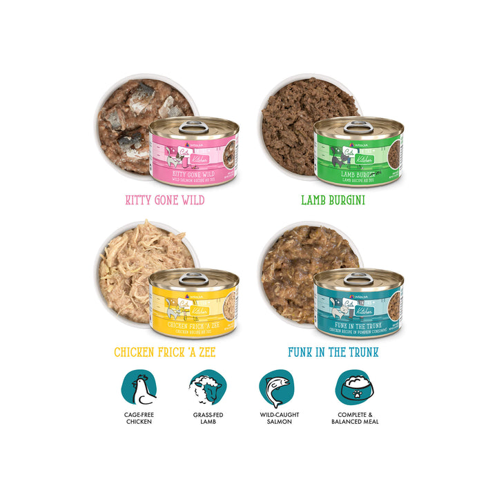 The Variety Pack offers a great way to test out flavors and provide your cat with a diet full of tasty variety. The Variety Pack includes: Funk in the Trunk, Chicken Frick' A Zee, Lamburgini and Kitty Gone Wild.