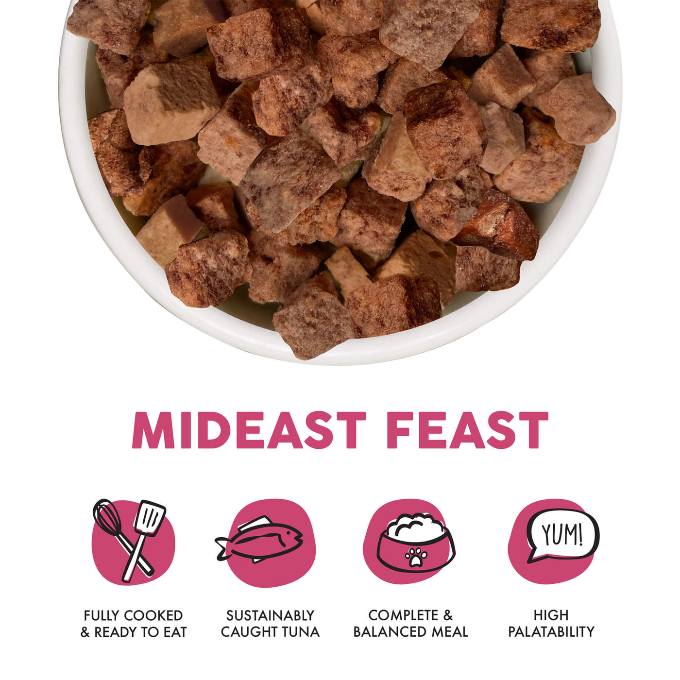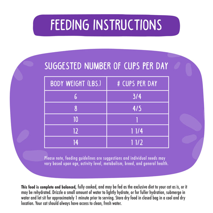This food is complete and balanced, fully cooked, and may be fed as the exclusive diet to your cat as is, or it may be rehydrated. Feed ¾ cup per day for cats weighing 6 lbs, ⅘ cup per day for 8 lbs, 1 cup per day for 10 lbs, 1¼ cups per day for 12 lbs, and 1½ cups per day for 14 lbs. Please note, feeding guidelines are suggestions, and individual needs may vary based on age, activity level, metabolism, breed, and general health.