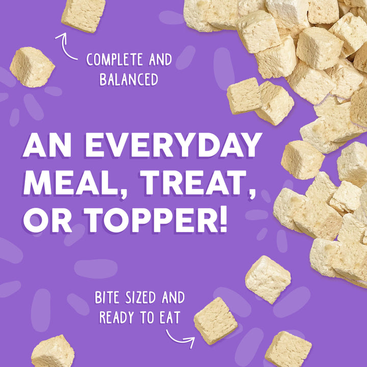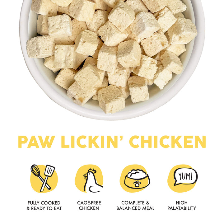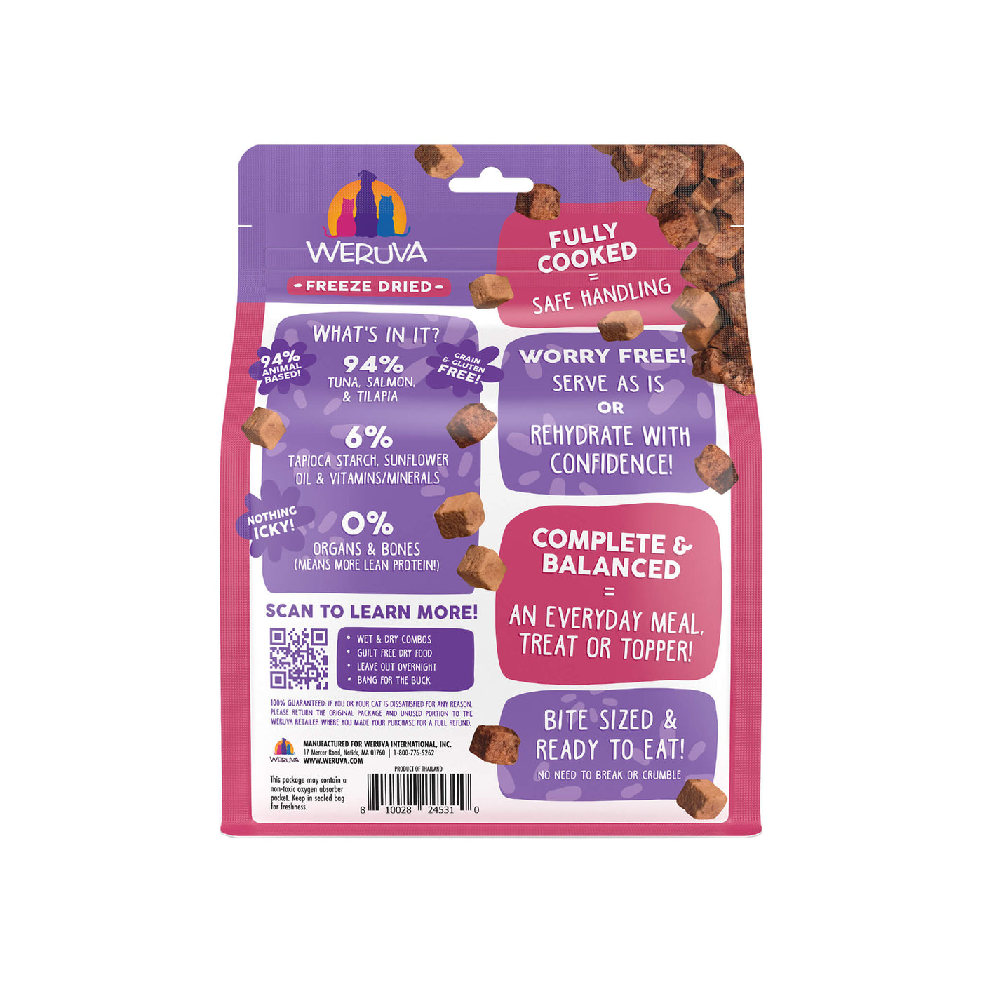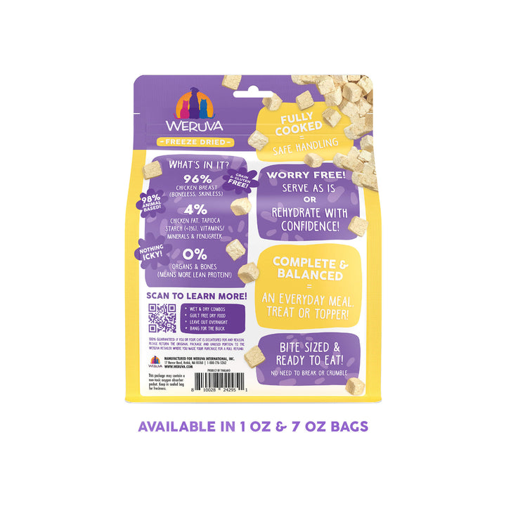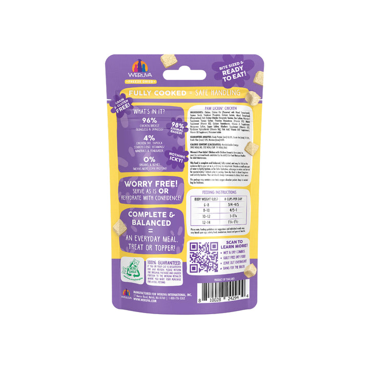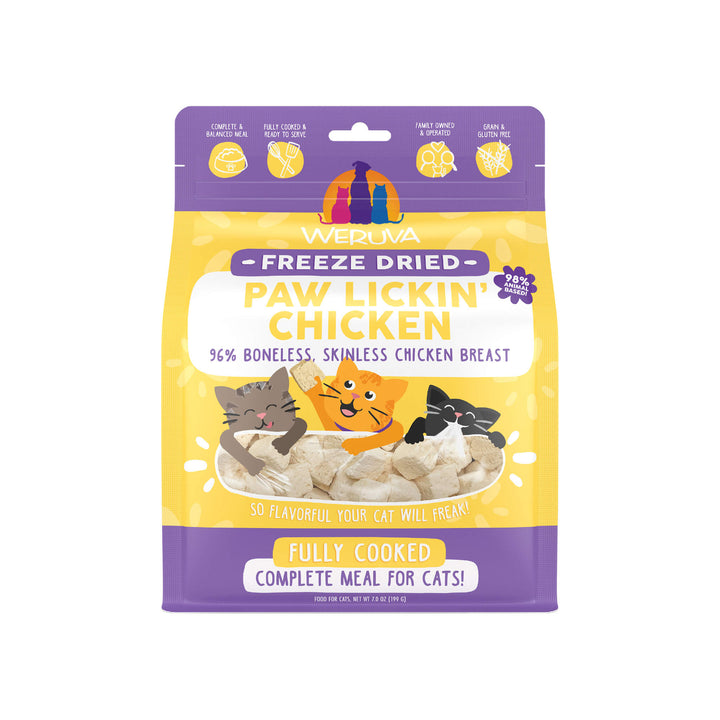 Weruva Freeze Dried Cat Food starts with high-quality animal protein that is gently cooked to lock in flavor and nutrients. This gently cooked high-protein cat food is then freeze-dried to create a shelf-stable, easy-to-serve meal that rehydrates quickly for a fresh, appetizing texture.