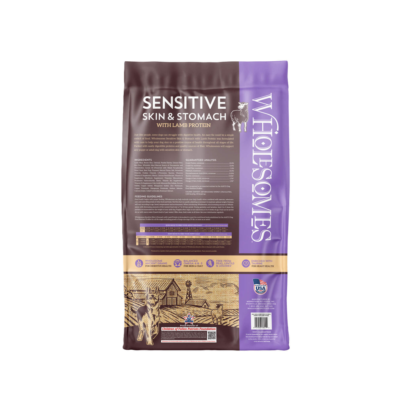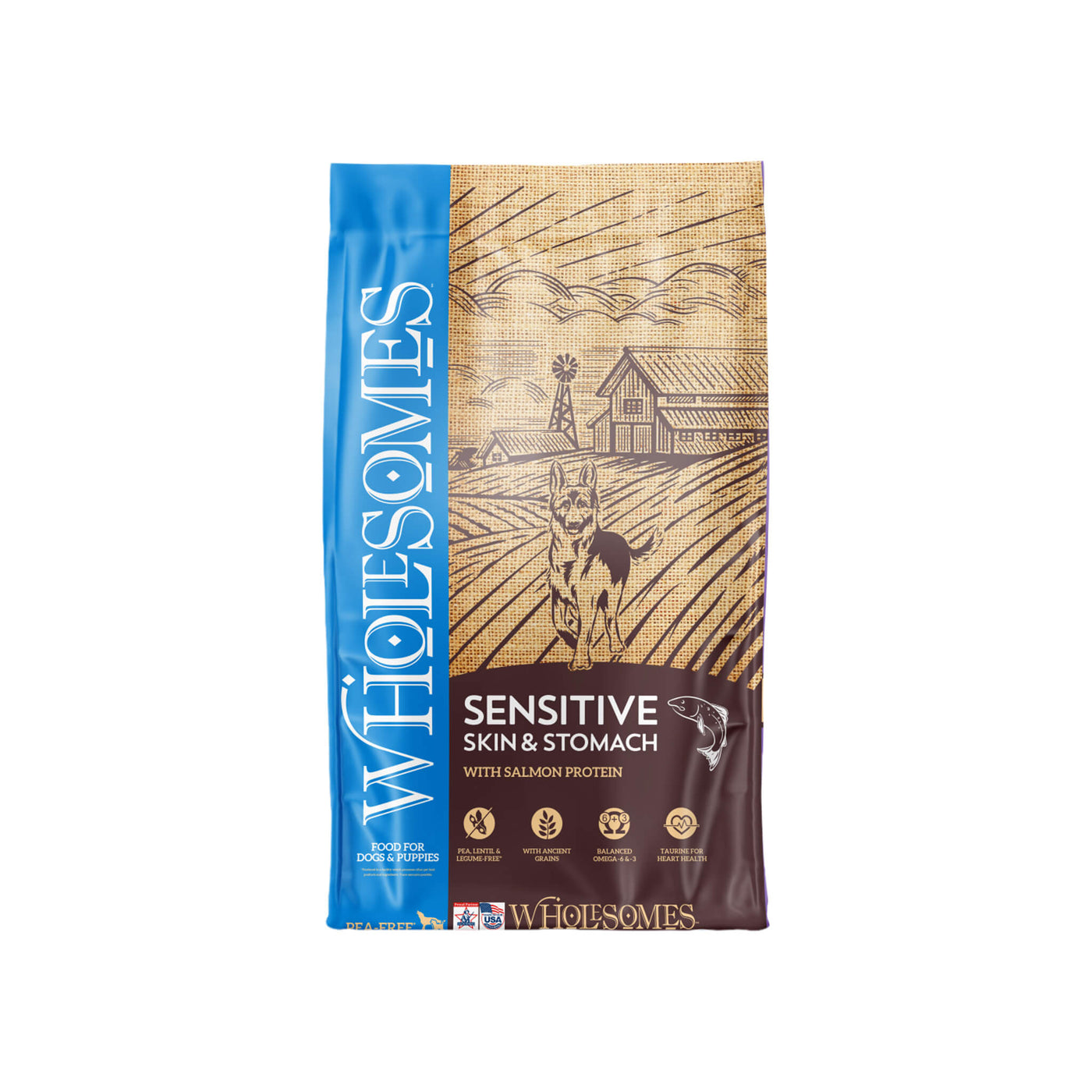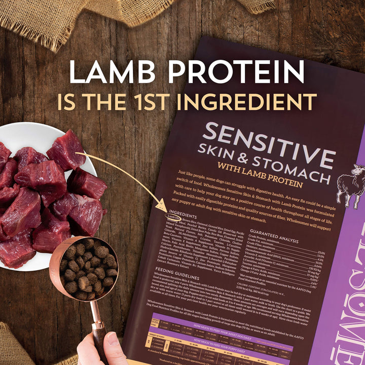 Wholesomes Sensitive Skin & Stomach Dry Dog Food is dog food for sensitive stomach made with lamb or salmon protein and nourishing ancient grains. This legume-free formula supports digestion and skin health with fiber-rich oatmeal, taurine, and omega fatty acids.
