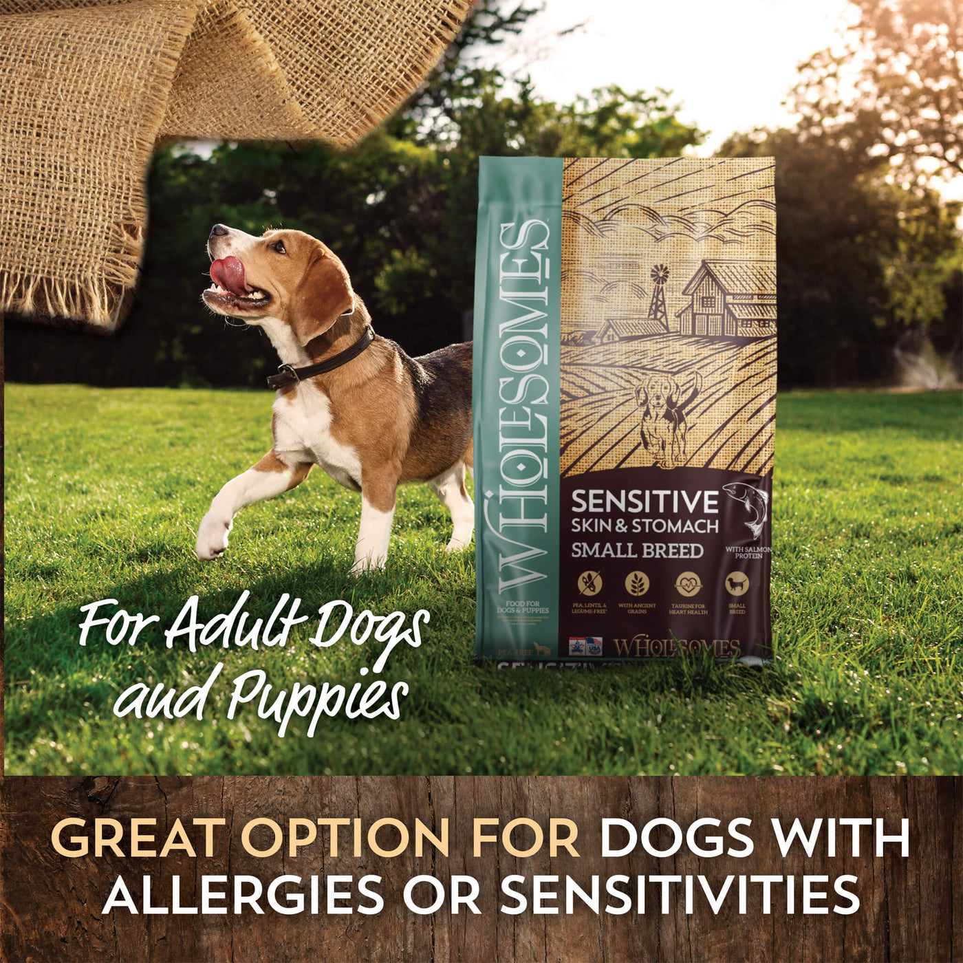 Wholesomes Sensitive Skin & Stomach Small Breed Dry Dog Food is crafted to support small dogs with dietary sensitivities. This small breed sensitive stomach dog food features easily digestible salmon protein and ancient grains to promote gentle digestion and skin health across all life stages.