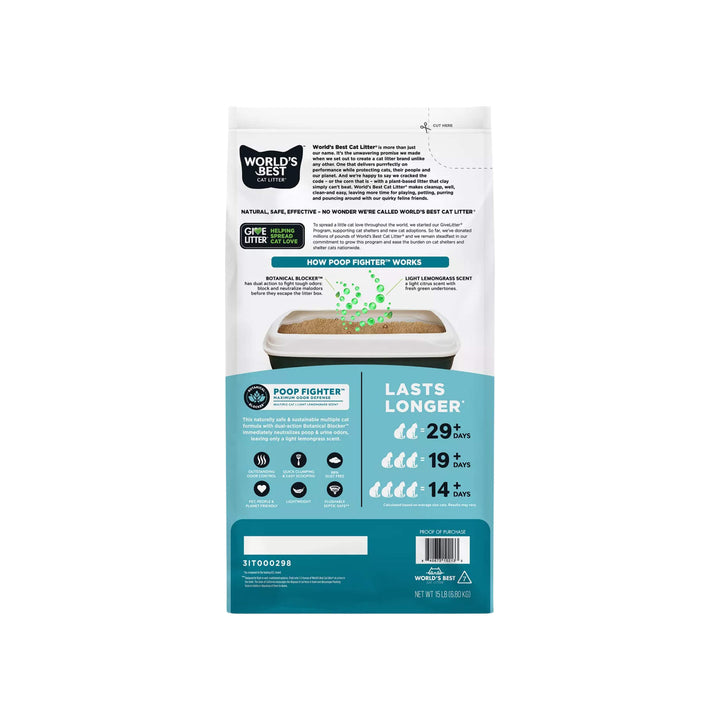 Tired of holding your breath every time you clean the litter box? World's Best Cat Litter Poop Fighter brings next-level odor control to your home using natural ingredients and long-lasting clumping power. This odor control cat litter is made from whole-kernel corn and infused with a plant-based blend designed to tackle strong smells without synthetic fragrances or chemicals.