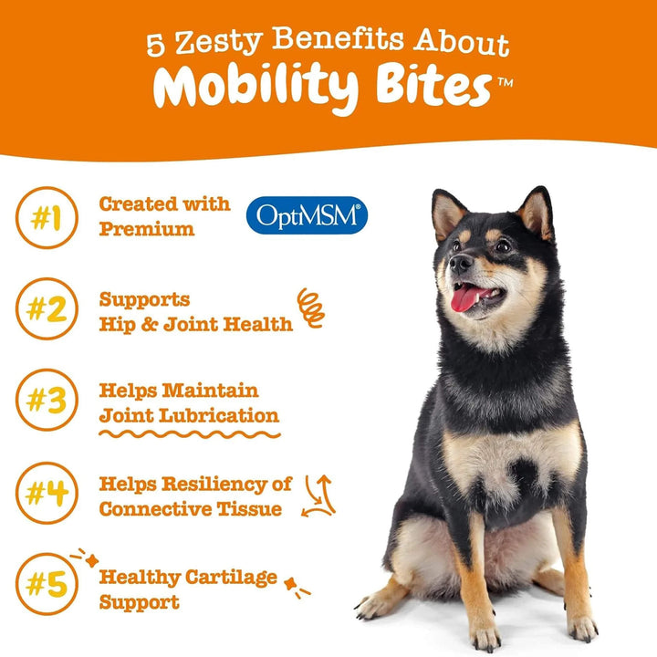 Zesty Paws Hip & Joint Bites for Dogs are formulated to support healthy hips, joints, and connective tissue. These daily dog joint supplements feature ingredients like glucosamine, chondroitin, and OptiMSM® to promote flexibility and mobility.