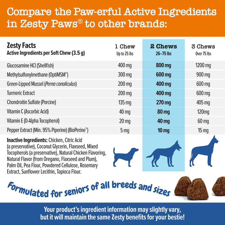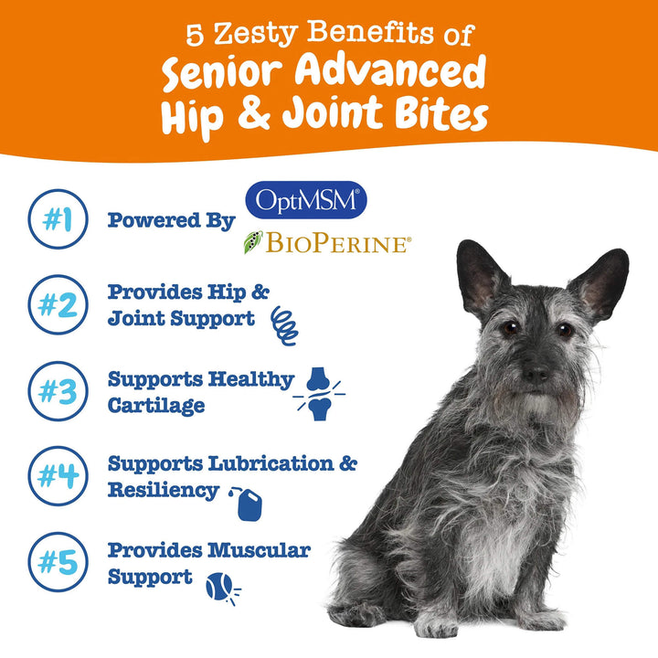 Zesty Paws Senior Advanced Hip & Joint Bites are formulated to support mobility, comfort, and joint function in aging dogs. These senior dog joint supplements include glucosamine, chondroitin, and OptiMSM® to help maintain cartilage health and ease stiffness.