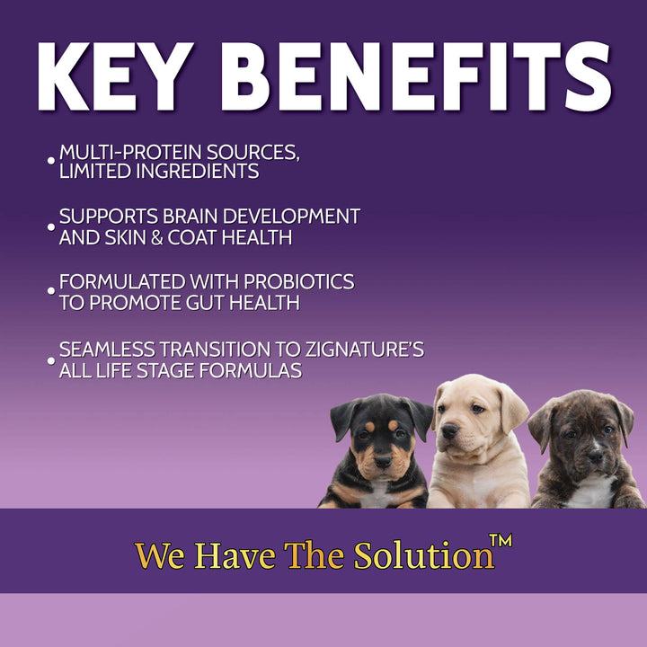 Support healthy development with Zignature Puppy Food—a balanced, limited ingredient dog food for puppies. Give your pup the best start today!