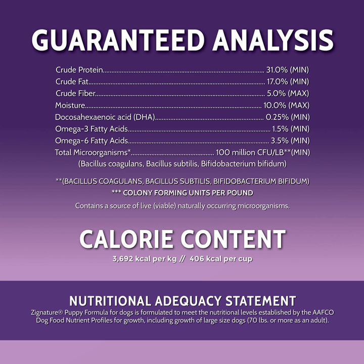 Zignature® Puppy Formula for dogs is formulated to meet the nutritional levels established by the AAFCO Dog Food Nutrient Profiles for growth, including growth of large size dogs (70 lbs. or more as an adult).