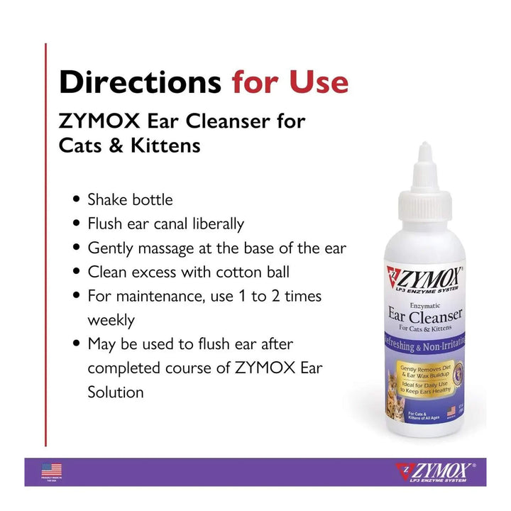 Zymox Enzymatic Ear Cleanser is a cat ear cleanser designed to gently clean and deodorize without irritation. Formulated with the trusted LP3 Enzyme System, it helps maintain ear hygiene in cats and kittens while supporting the natural defenses of the ear canal.